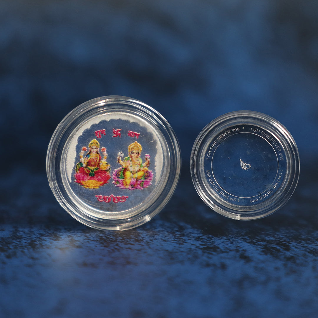 999 pure silver 1 gm colorful Lakshmi Ganesh coin with Shubh Labh inscription. Perfect for Diwali, puja rituals, and auspicious gifting. Detailed artistry with kalash, diya, and puja items at the base enhances its festive aura. The ornate border gives it a traditional decorative frame.