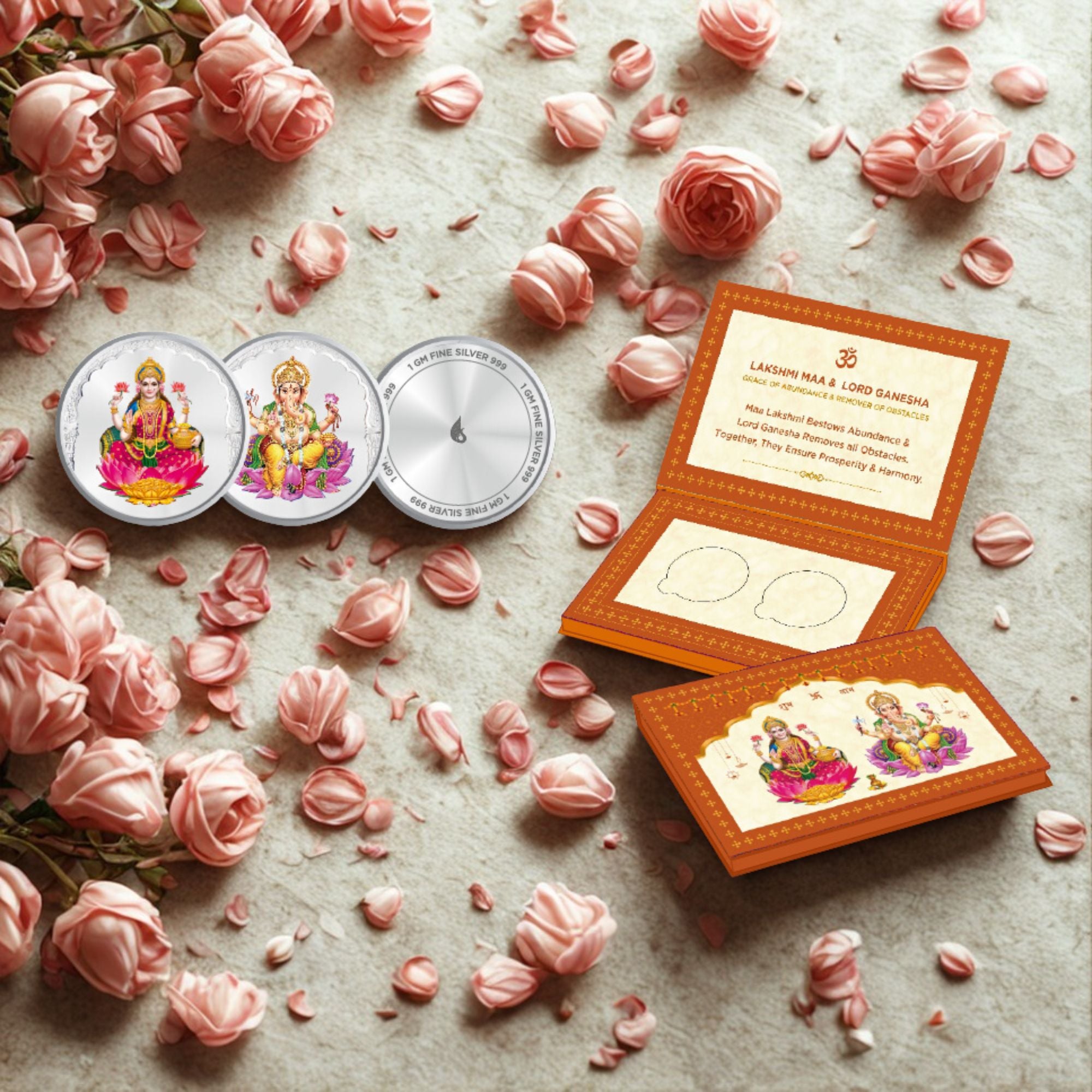 999 pure silver 1 gm each colorful Lakshmi Ganesh coin with Shubh Labh inscription. Perfect for Diwali, puja rituals, and auspicious gifting. Detailed artistry with kalash, diya, and puja items at the base enhances its festive aura. The ornate border gives it a traditional decorative frame.