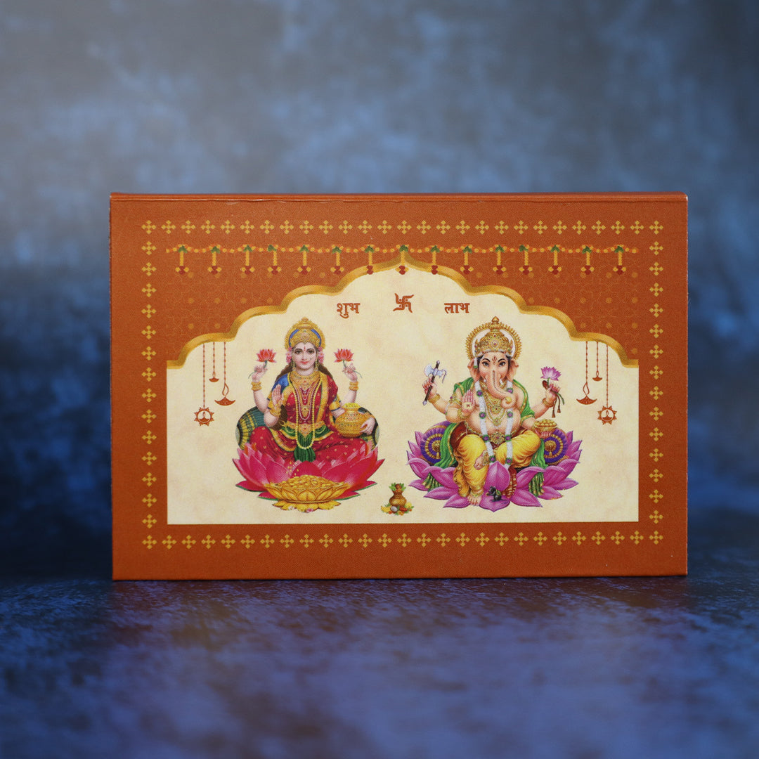 These coins features Maa Lakshmi and Lord Ganesha seated on lotus thrones, richly colored and intricately embossed. Maa Lakshmi holds lotus flowers symbolizing prosperity, while Lord Ganesha carries his divine attributes for wisdom and success. The top of the coin carries the auspicious inscription “शुभ लाभ” (Shubh Labh), invoking blessings of prosperity and good fortune.