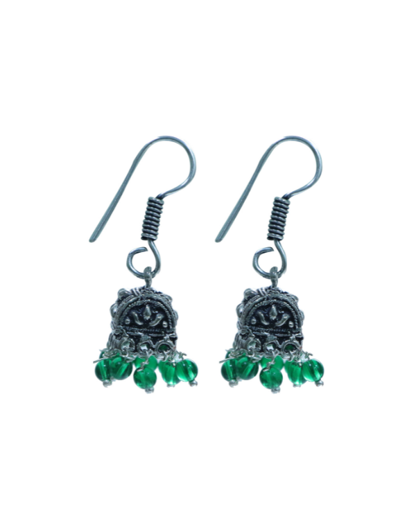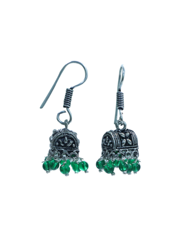 Pair of Small Ethnic Jhumkis in Silver Alloy and Green Beads High Finish for Women and Girls Stylish Latest Tribal Boho Look Birthday Anniversary Gift for Mother Bhabhi Wife Sister Friend